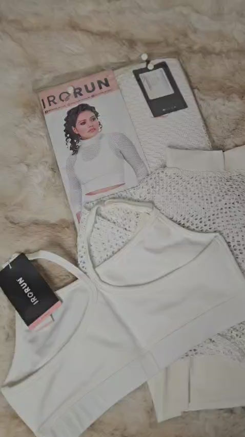 - With a high neckline and long mesh sleeves, it’s worn over a separate white sports bra to create a breathable, stylish silhouette.